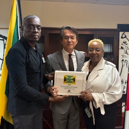 1月23日、丸山大使は、ジャマイカUCCブルーマウンテン・コーヒー社のマクコック総支配人およびワッツ通商・総務マネジャーと面会しました。大使からは、ハリケーン・メリッサによる被害に対するお見舞いの言葉を述べるとともに、ブルーマウンテン地域のコーヒー農園の現状や、日本とジャマイカの長年にわたるコーヒー分野での協力関係について意見交換を行いました。