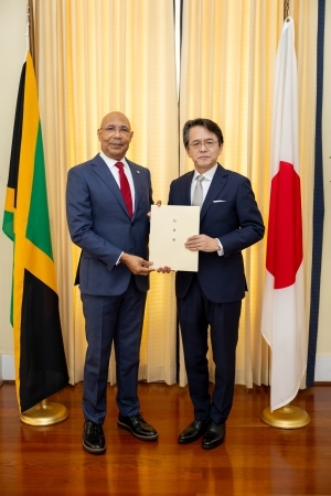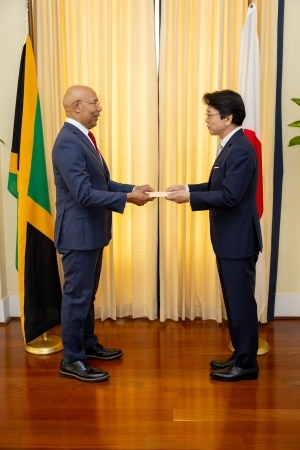 パトリック・アレン総督に対する信任状捧呈(2026年1月20日) 令和8年1月21日 (ENGLISH) 1月20日、丸山大使は、ジャマイカ総督官邸(キングスハウス)において、パトリック・アレン・ジャマイカ総督に対して信任状を捧呈し、日本国特命全権大使として正式に活動を開始しました。 (写真提供: ジャマイカ総督官邸)