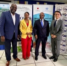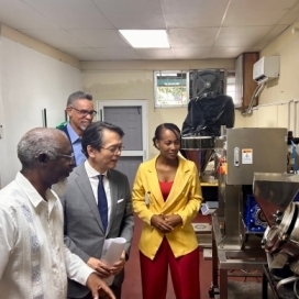 4月16日、丸山大使は、ジャマイカの農産加工分野を中心とした中小零細企業(MSMEs)を支援する公募の開始イベントに出席しました。本プログラムは、日本政府が国際連合工業開発機関(UNIDO)を通じて実施している無償資金協力の一部で、カリブ共同体加盟国における産業振興や技術移転の促進を目的としています。日本は本取組みを通じて、持続可能な産業の発展や経済の強化に向け、ジャマイカとのパートナーシップを引き続き推進していきます。イベントには、ヒル産業・投資・商業大臣、デービス・ジャマイカ・ビジネス開発公社(JBDC)CEO代理、水野UNIDOプロジェクトマネージャーをはじめとする関係者が出席し、式典の後には農産加工インキュベーターの施設視察も行われました。